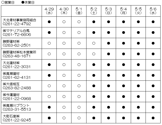 ご希望により営業する場合もございますので、その際はお早目に各工場へご連絡ください。